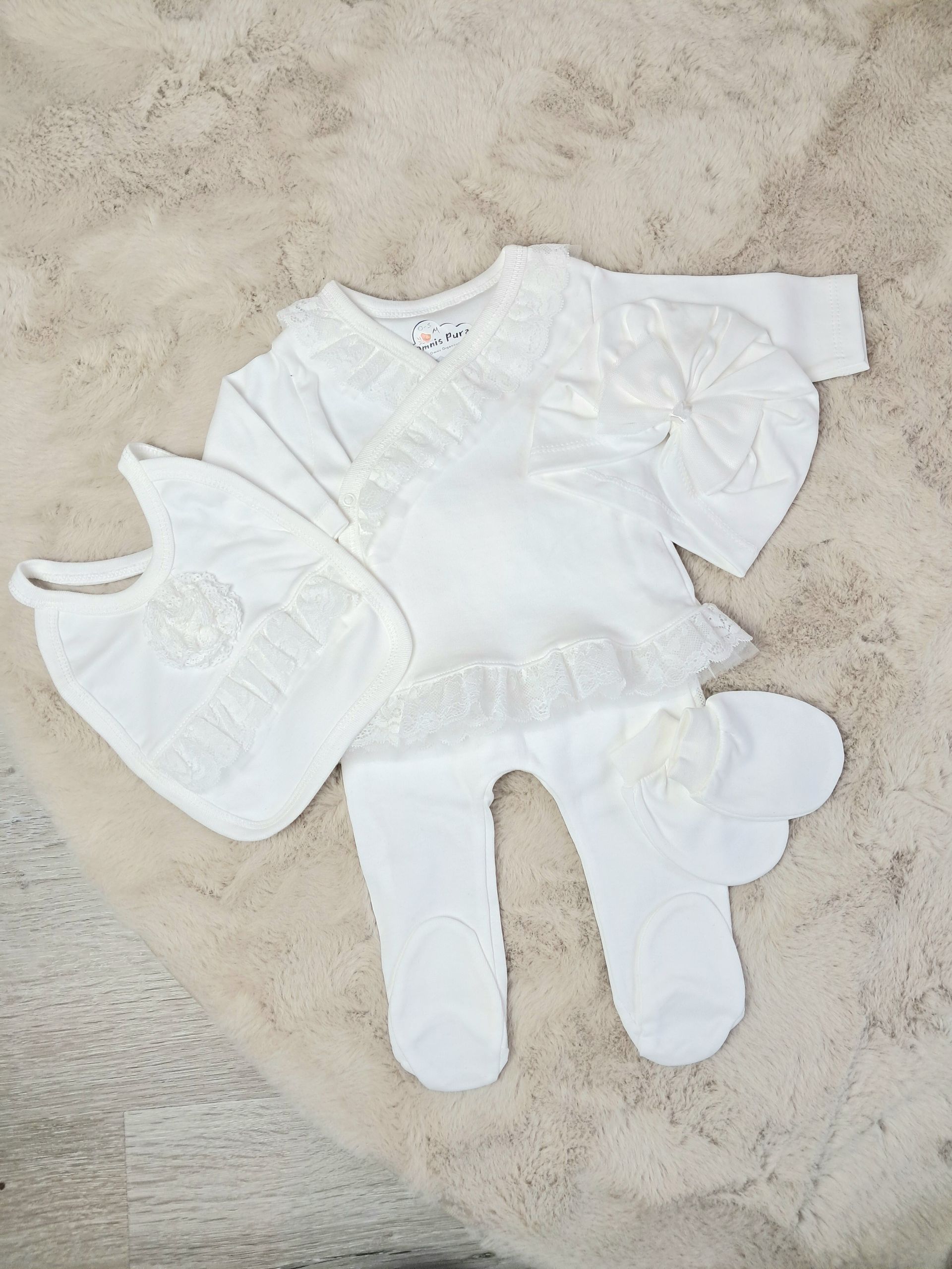 Mooi newborn setje inclusief: muts, slabber en handschoentjes. Het broekje heeft een schattig detail op de billen.